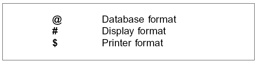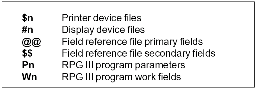 Device files should use a format identifier of #n for display devices and $n for printer devices. The identifier #Q is reserved for message subfiles. The format identifier need not be shown on the actual format names of device files, since you may want to use names that emphasize the role of the formats within a standard program type. Such formats will be few in number and should be named using the OS/400 naming principles, but the names should still begin with a character to indicate the format type. For example: