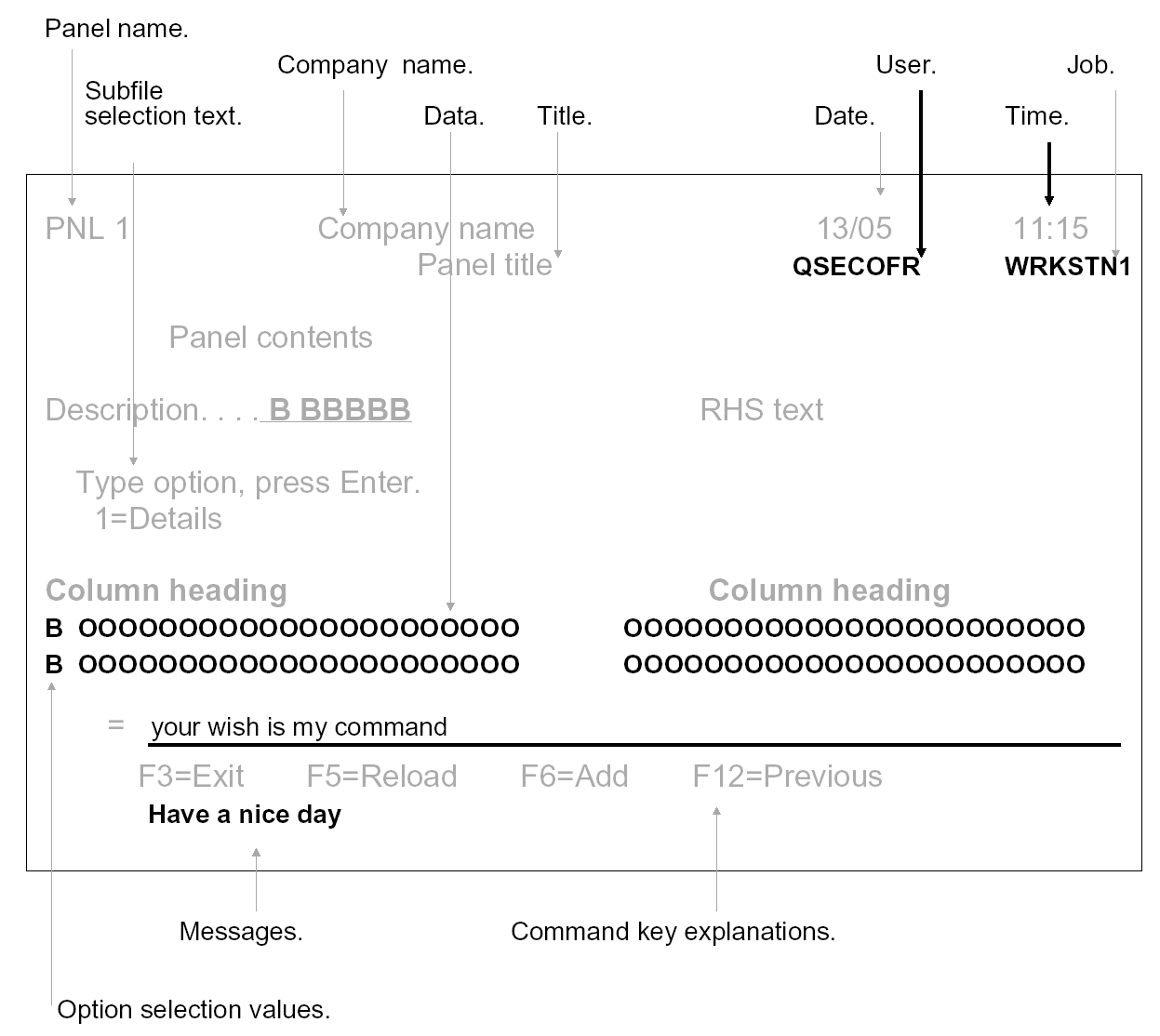 The CUA panel layout standard can be interpreted either strictly, leaving off all ancillary data such as date, time, or operator identification, or more leniently, keeping the CUA components in the standard places, while adding in the extra information.