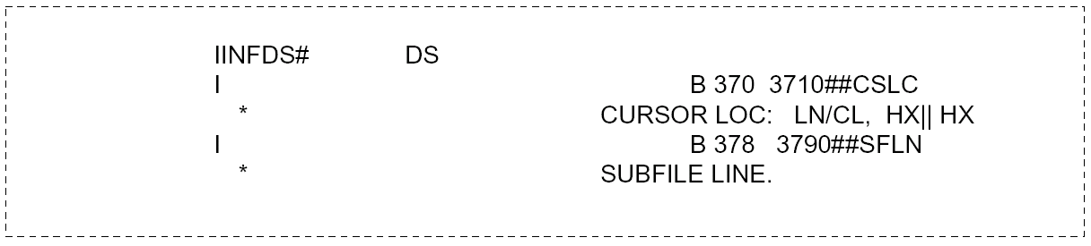 Use the program status data structure, defined with an ‘S’ in column 18, to retrieve information about the operator, for example, user profile name, job name, and job number. Never ‘hard code’ the user profile name or program name as a literal.