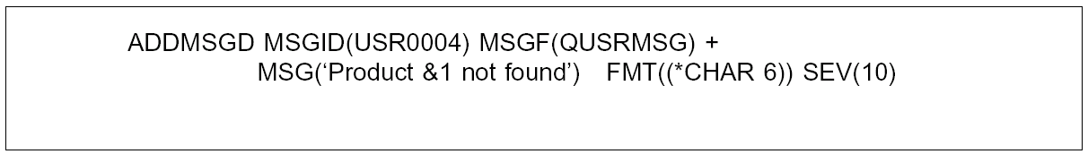 Message substitution variables should be used where helpful—they can be particularly useful in conjunction with input capable subfiles, as the variables can be used to distinguish which line in the subfile is in error. For example, on a subfile panel that shows many products, ‘Product code &1 not found’ (where &1 is the missing product) will be more useful than just ‘Product code not found’.