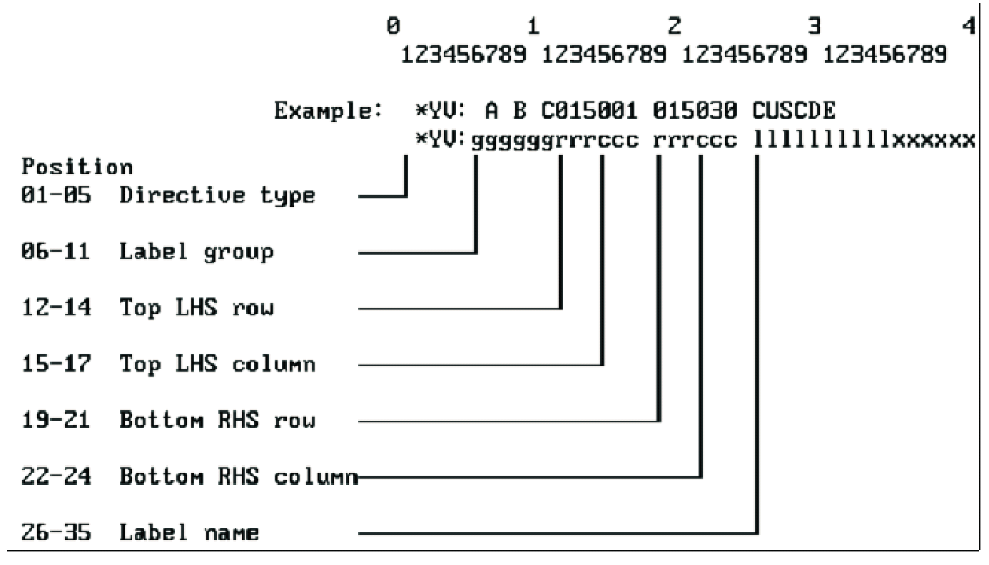 Label name: must refer to the label specified on a *YH: directive placed in the body of the help text. You may also specify the same label on an index entry directive (*YI:), though this is optional. Any text in columns 36-80 following a label name will be ignored.
