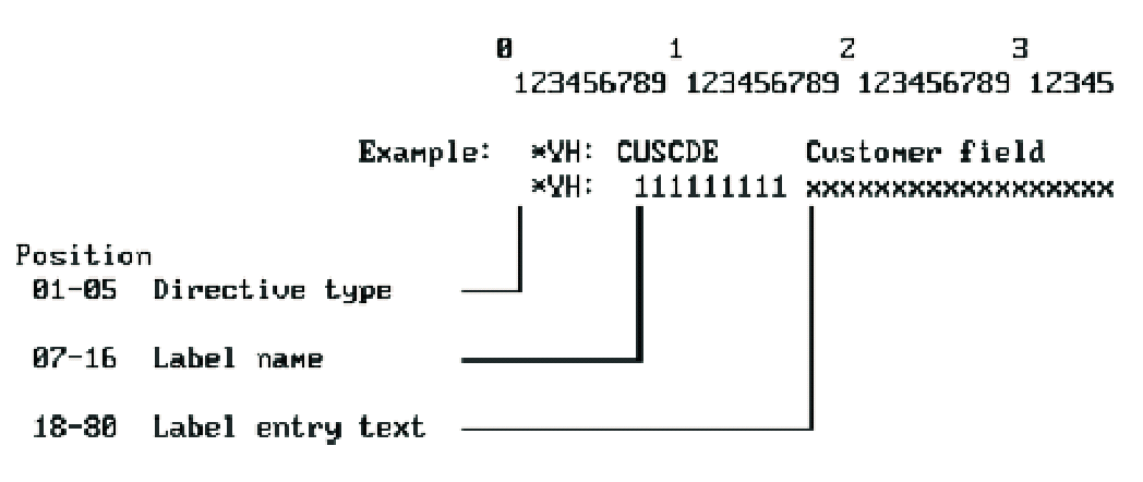 Each label directive identifies a point in the help text at which the help text display is to start or to which it may branch under the user’s direction. Each *YH: entry should have a label corresponding to that of a *YV: or *YI: entry (unmatched entries will be ignored). The Help text display program starts a new page for each label found.