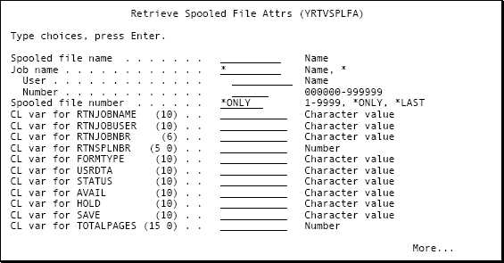 The YRTVSPLFA (Retrieve Spooled File Attributes) command can only be run from within a compiled CL program or module and allows the program to retrieve the attributes of a given spooled file. Similarly to IBM spooled file commands, the only required parameter is the spooled file name (although the job name and spooled file number are optional input parameters). All other parameters are output parameters that return values into defined CL variables. This command uses the QUSRSPLA API to retrieve the attributes for the specified spooled file.