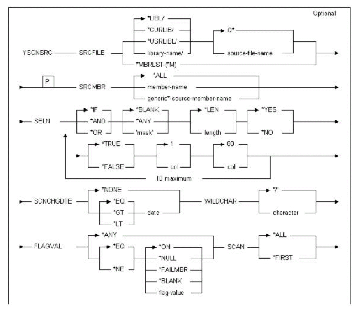 CA 2E Toolkit Commands, YD to YW › YSCNSRC (Scan Source Member) › Syntax Diagram