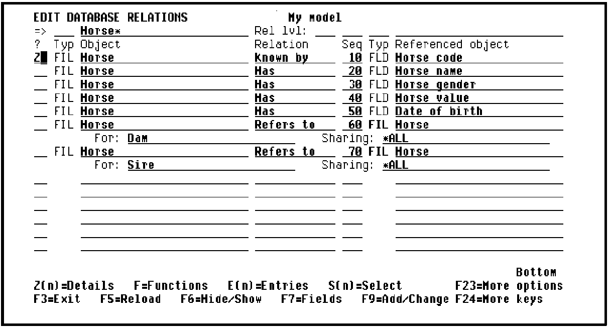 Display the relations for the HORSE file from the Edit Database Relations panel by typing Horse* on the selection line and pressing Enter. To display the access paths for the HORSE file, zoom into one of the relations for the file on the Edit Database Relations panel. Type Z against one of the relations.