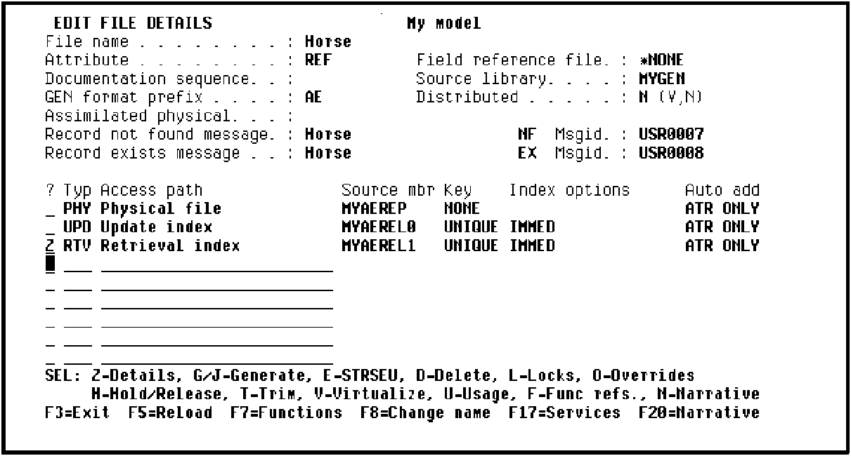 Press Enter to validate the addition of the virtual fields to the Retrieval index access path for the HORSE file.