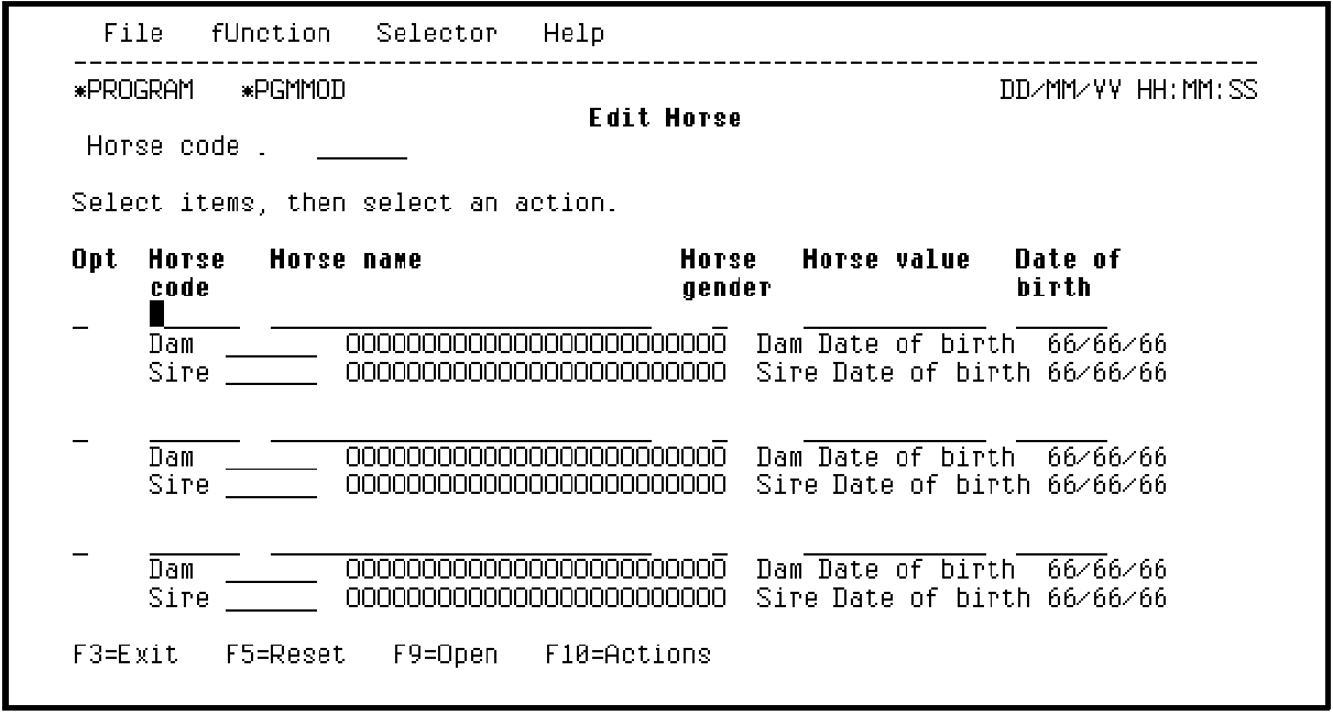 When the Edit Horse function is implemented, the program automatically includes code to check the validity of each input capable field on the subfile record. By default, every relation must be satisfied. This will cause the resulting application to check the HORSE file when the end user specifies a Dam Code. The Dam code must be that of a valid female horse. This presents a potential problem. When the end user adds the first horse to the application, it will be rejected. This is because there are no horses existing on the file at that time that are available as parents (Dam or Sire).