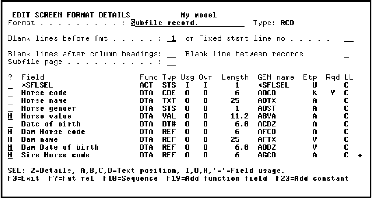 The Edit Screen Format Details panel contains a list of all fields associated with this function. You may not want to show all of the fields on your panel. You can hide fields you do not want displayed by typing H in the Subfile selector of the Edit Screen Format Details panel.