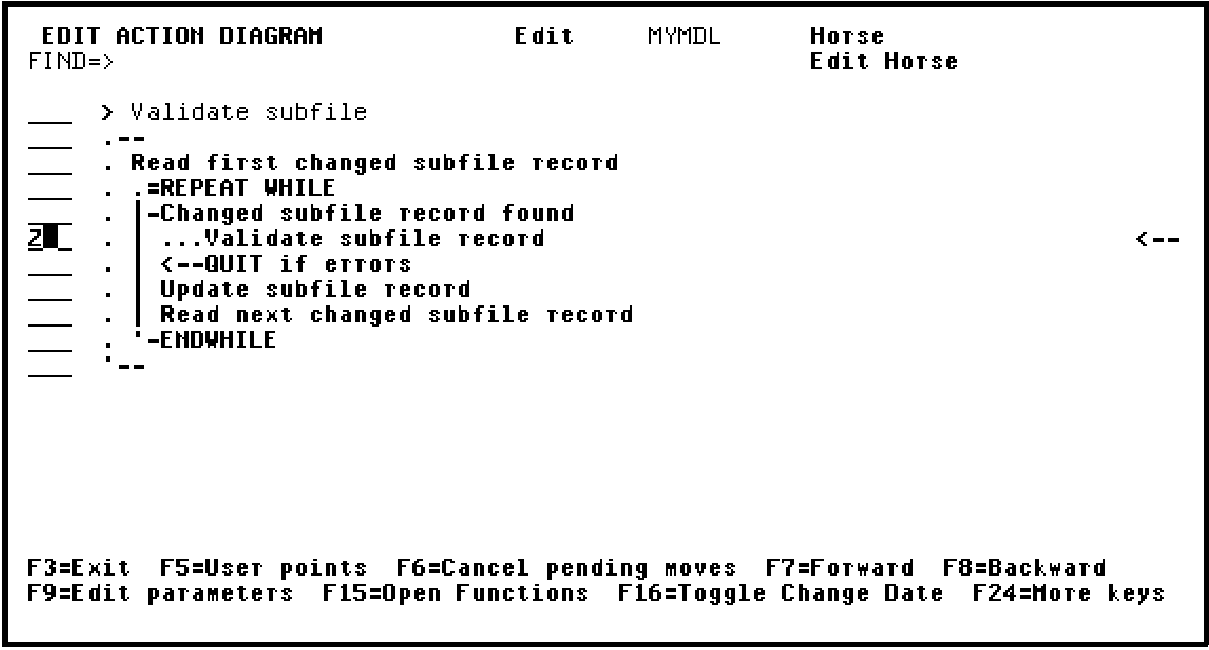 Note the hidden ...Validate subfile record construct that results when you expanded the ...Validate subfile construct. Validation of subfile record input is carried out on any subfile records that have been changed by the end user. Subfile record fields and relations are automatically validated according to the specifications declared in the design process. This is summarized as follows: