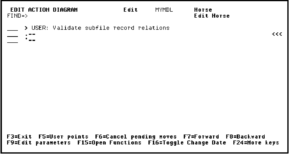 In this step you will use the action diagram editor to add your own validation procedure. Add the procedure to the USER: Validate subfile record relations user point.