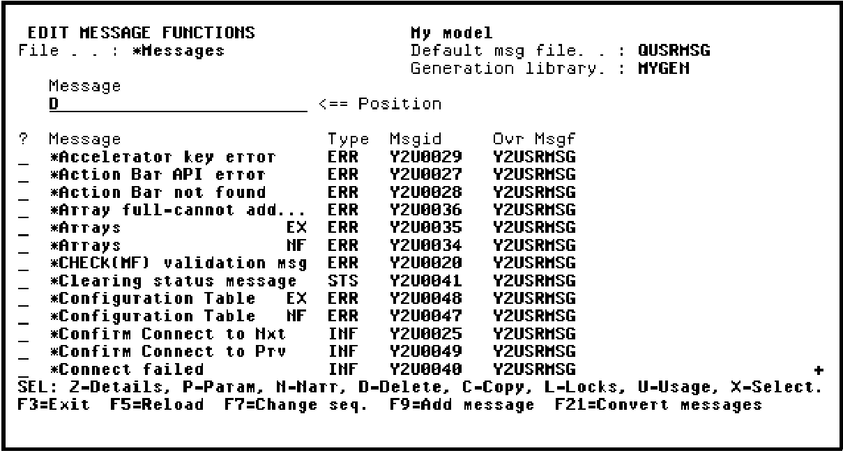 The Edit Message Functions panel displays a list of the message functions available on the file *Messages. Type D in the positioner field at the top of the panel as shown to position to the Dam younger than horse message function you just defined.