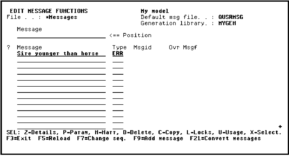 To define the second message function you need to specify a function name and a function type as you did for the first message function. Name the message function Sire younger than horse. The type will be ERR. Type the message name and type.