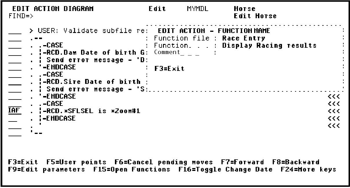 Press Enter to return to the Action Diagram Editor. Note that the name of the Display Racing results function has been inserted in the Edit Action - Function Name window.