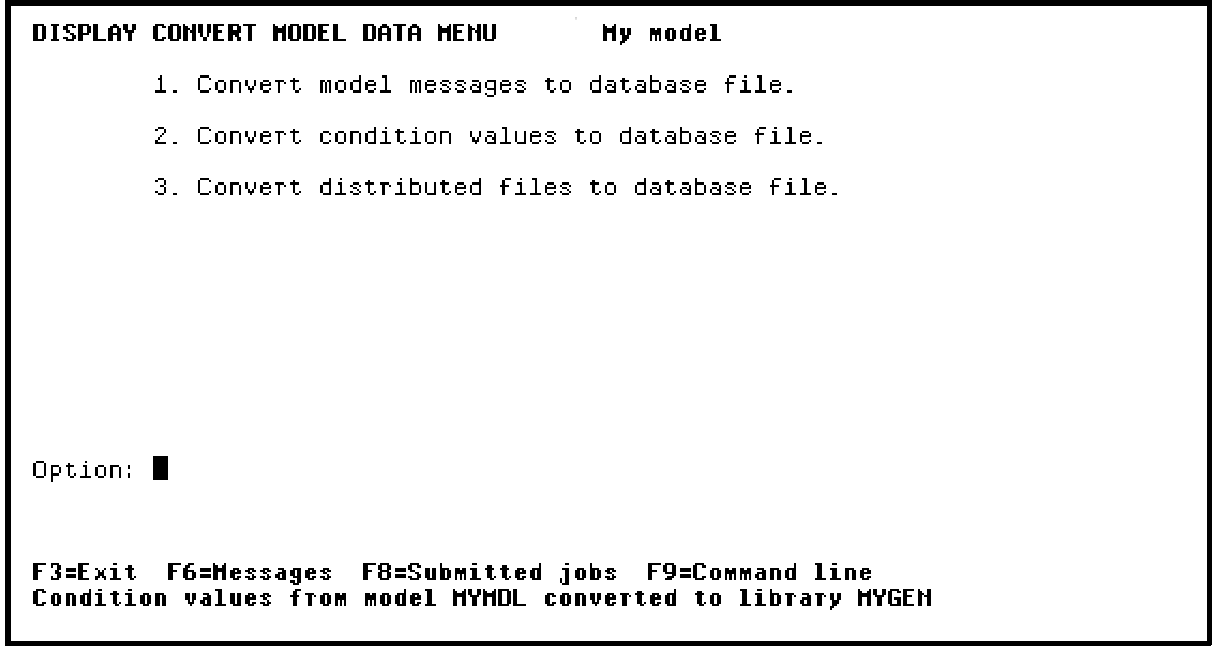 Once the values allowed for the status fields in your model have been converted to the database file, you will be returned to the Display Convert Model Data Menu. A message appears at the bottom of the panel to indicate that the conversion is complete.
