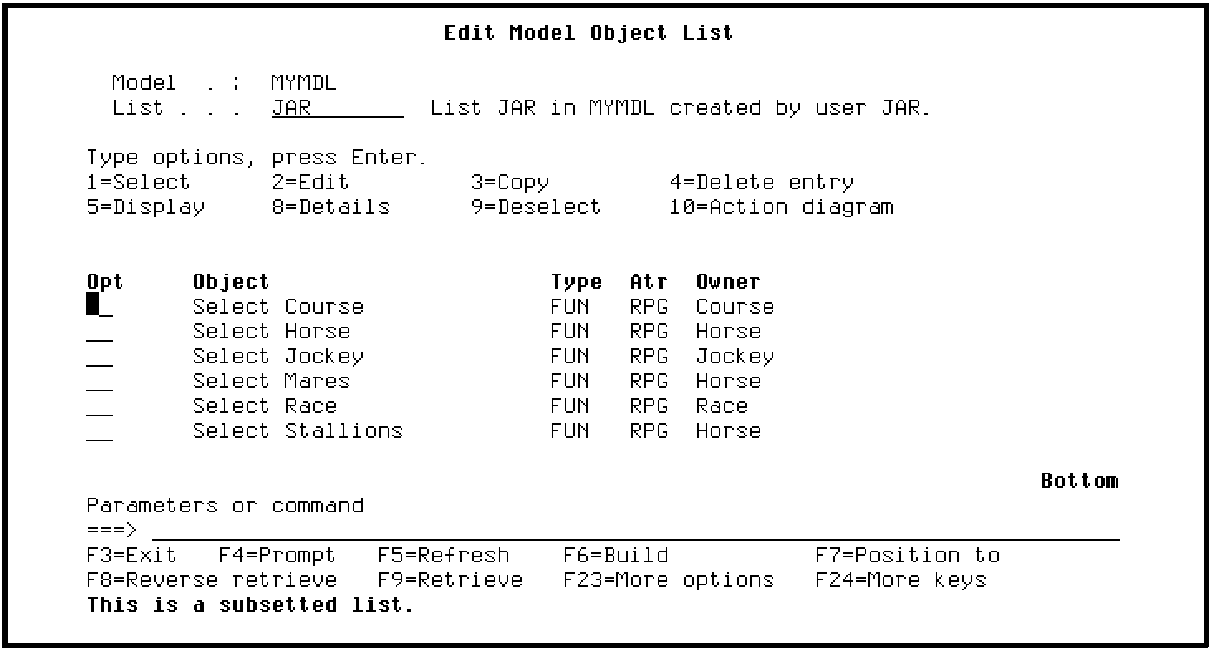 Suppose you want to view all Select Record (SELRCD) functions on your session list. To do so, press F17 to display the Subset Model Objects panel. (Press F24 to see more command keys.) Type *FUN for the Type field and type SELRCD for the Function type field.
