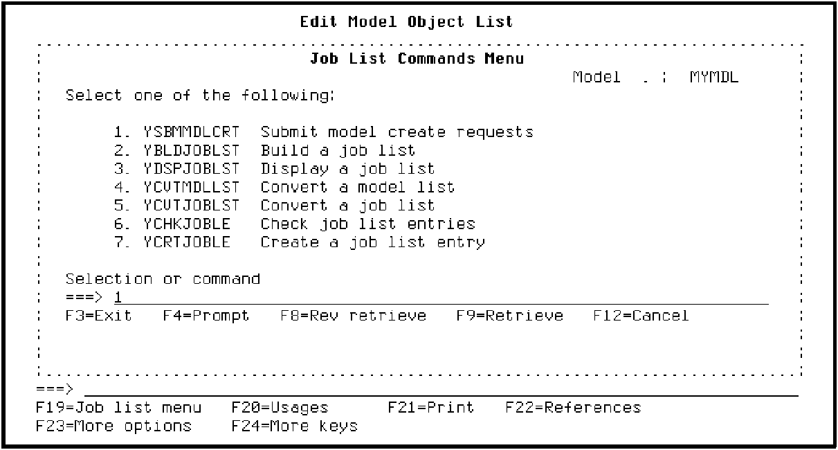 Press F19 to display the Job List Commands Menu. Type 1 on the Selection line to select the YSBMMDLCRT command.