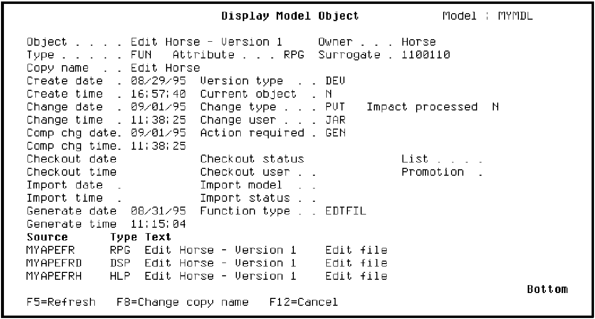 Note that the Object Name, Edit Horse - Version 1, and the implementation name shown in the Source column, MYAPEFR, do not match the corresponding information shown on the Edit Model Object List panel for the Edit Horse list entry.