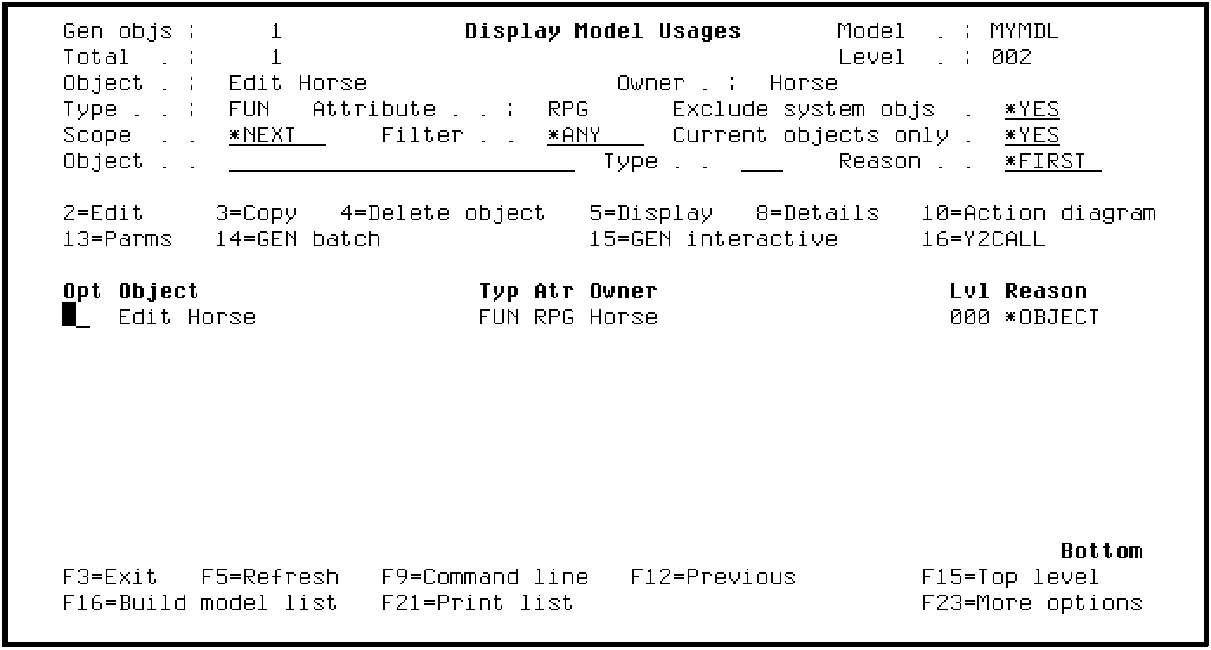 Type 91 against Edit Horse and press Enter to display its usages. The Display Model Usages panel redisplays showing only the model object itself. This indicates that no other model objects use Edit Horse; in other words, it has no usages.