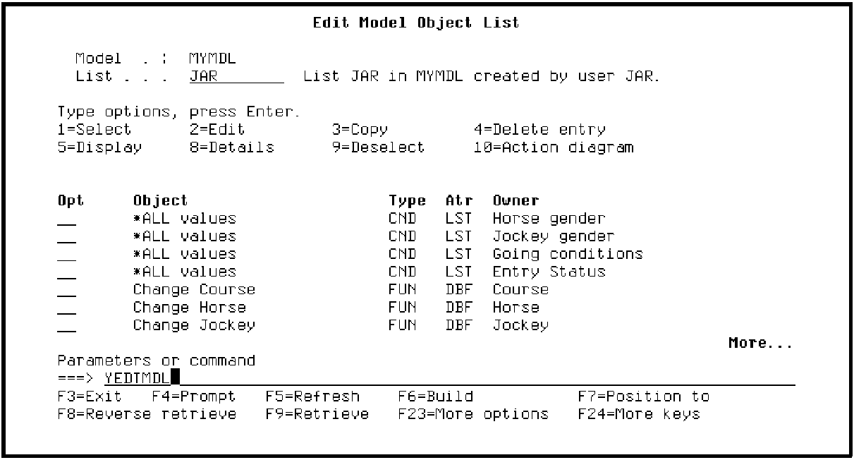 At this point you can exit the model by pressing F3. If you want to continue with the tutorial, you can use either the Edit Model (YEDTMDL) command or the Start CA 2E (YSTRY2) command to reenter the model at the Edit Database Relations panel.