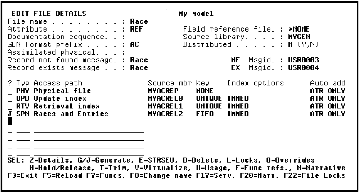 You have now finished the definition of the Races and Entries SPN access path. Request batch generation of the Races and Entries access path by typing J against it