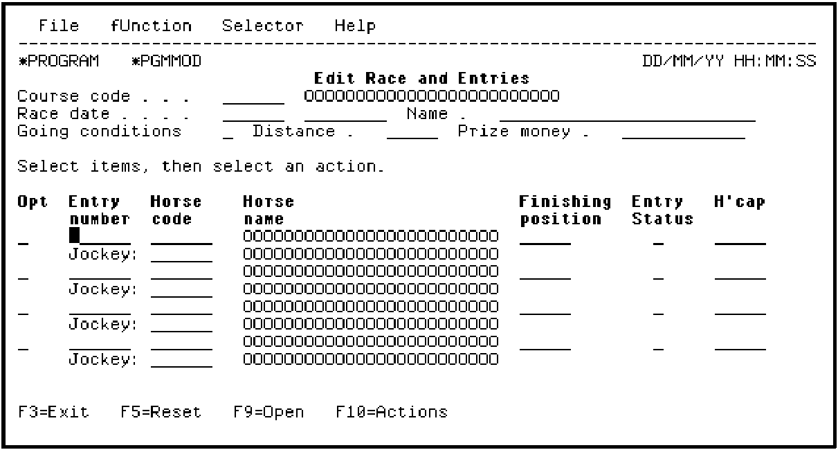 To make some of the fields in the RACE ENTRY file optional, position the cursor on a field in the first subfile record.