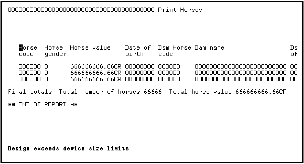 Type the options as shown; namely, type Y for Blank line between records, type O against Horse name, and type H against Horse code, Dam Horse code, and Sire Horse code to hide these fields on the report.