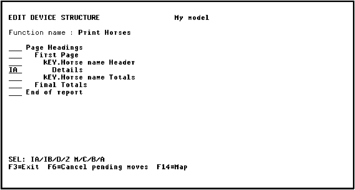 The next step is to combine the two functions so that the records from the Print Object function (each race entry) will be printed after each detail record in the Print File function (after the horse to which it applies). To do this, you will use the Edit Device Structure panel.