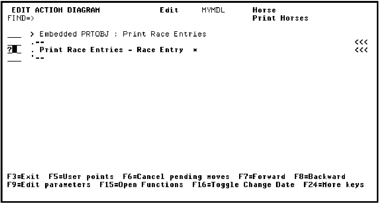 You have now reached the point in the action diagram where the PRTOBJ is embedded. Type Z against the hidden construct, ...Embedded PRTOBJ : Print Race Entries.