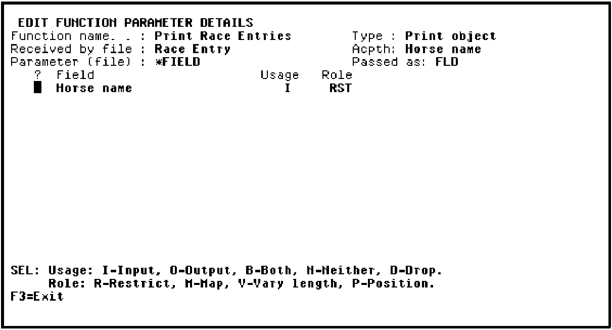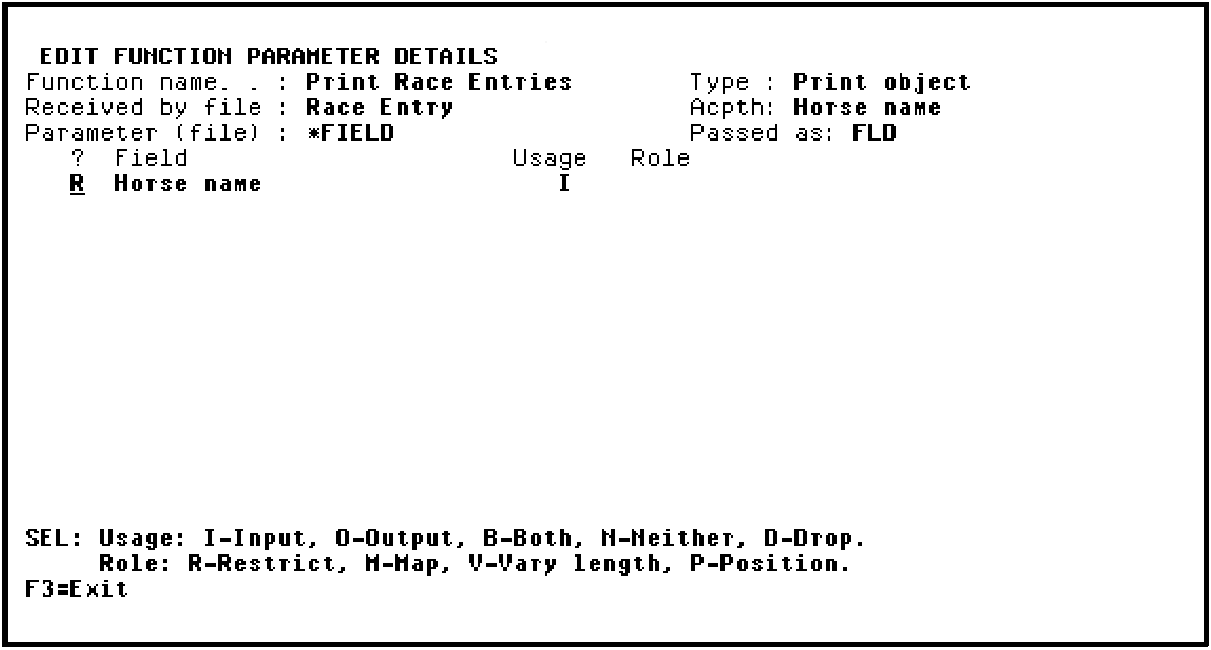 On the Edit Functions Parameter Details panel you will specify the usage and role of the Horse name parameter. In this case, the parameter defaults to Input (I). You will specify that the parameter has a restrictor role by typing R in the Subfile selector. This will cause the Print Race Entries program to process only those records on the RACE ENTRY file for the horse identified by the Horse name parameter.
