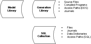 Each CA 2E model must reside in a single library called the model library. Each model must also have a generation library associated with it. Models and generation libraries may also be associated with SQL collections. The collection is a separate library similar to the generation library.