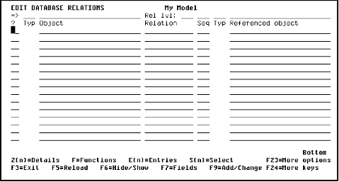 Use the Edit Database Relations panel to enter relation statements to declare the entities in your data model. The panel shown in the following illustration has three main columns labeled Object, Relation, and Referenced object: