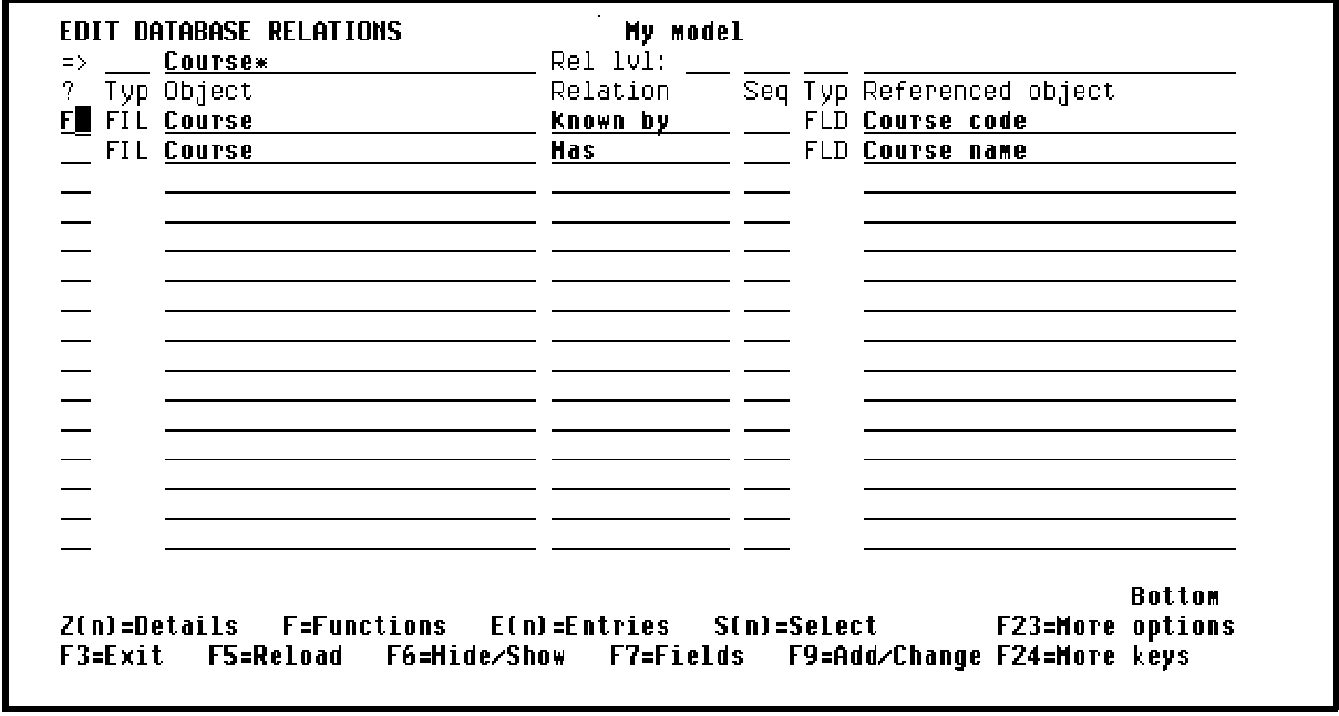 Next, display the functions for a particular file by typing F against the file on the Edit Database Relations panel. Enter F next to any COURSE file relation as shown in the following example: