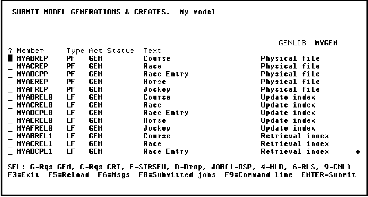 CA 2E displays a list of the source members to be generated and compiled. Each member has either GEN or CRT next to it to indicate whether the member has been submitted for generation or compilation. At this point all the functions and access paths should show GEN as shown in the following example: