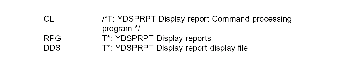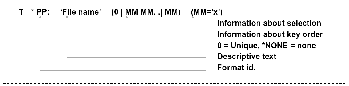 The text for database files should provide information about the access path. An index of the available access paths can then be effectively obtained directly from a listing of the object descriptions (using the OS/400 Display object description (DSPOBJD) or Display library (DSPLIB) commands), from a listing of the names of source members (made with the OS/400 Display file descriptions (DSPFD) command with an option of TYPE (*MBRLIST), or using the select facilities of SEU (EDTSRC/STRSEU)).