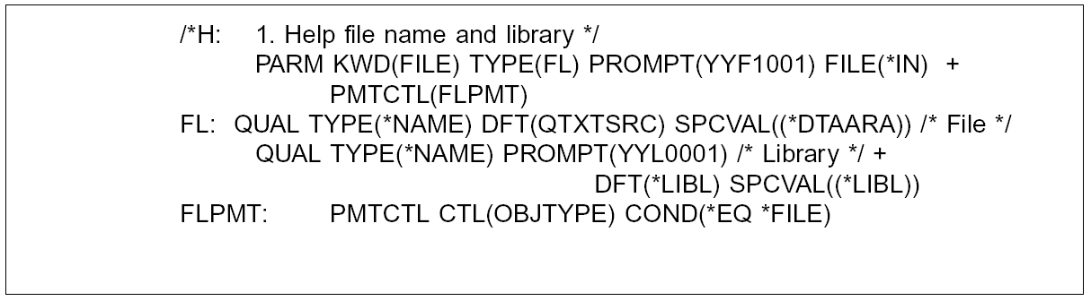 Place any ‘Element definition’ (ELEM) and ‘Qualifier definition’ (QUAL) statements to define command parameters that are lists, immediately after the first PARM statement they describe. This facilitates the copying of code from one member to another. For IBM i commands, PMTCTL statements should also be placed adjacent to the PARM statement they control.