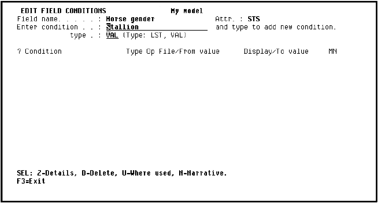 From the Edit Field Details panel for the Horse gender field, press F9 to display the Edit Field Conditions panel. This panel shows the available conditions for the field. Initially, there are none.