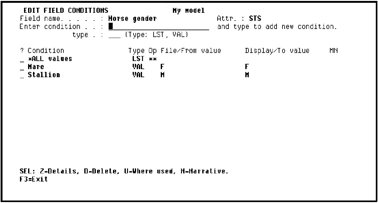 On the Edit Field Conditions panel for the Horse gender field, you should now see a list of the conditions that you have just added. Note that a special condition has been added automatically. This is the condition called *ALL values, shown at the top of the list of conditions. The *ALL values condition can be used when you wish to specify that a field may take any one of the individual values listed.