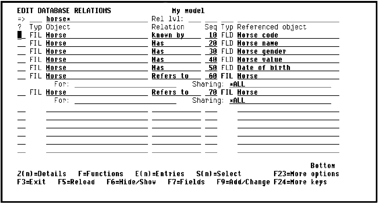 The entry in the Sharing field indicates whether the common keys of the two relations are to be shared. *ALL is the default. This field applies only when the referenced file has more than one key field entry. In this tutorial, since the HORSE file has only one key field entry (Horse code), you can take the default.