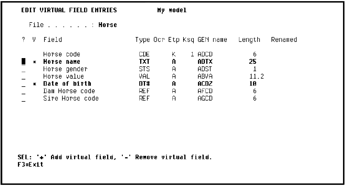 The virtual fields are indicated by an asterisk (*) in the V column of the panel confirming that CA 2E has created the virtual fields.
