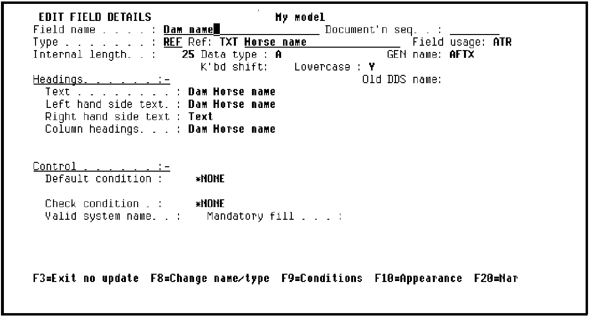 The cursor will now be on the Field name entry on the Edit Field Details panel. Rename the field by typing the new name over the existing name. Type Dam name over Dam Horse name.