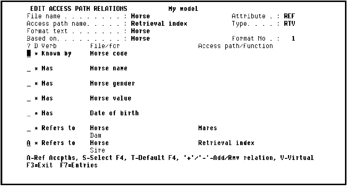 Repeat this process for the HORSE Refers to HORSE For Sire access path relation. In other words, change the referenced access path for HORSE Refers to HORSE For Sire from Retrieval index to Stallions.