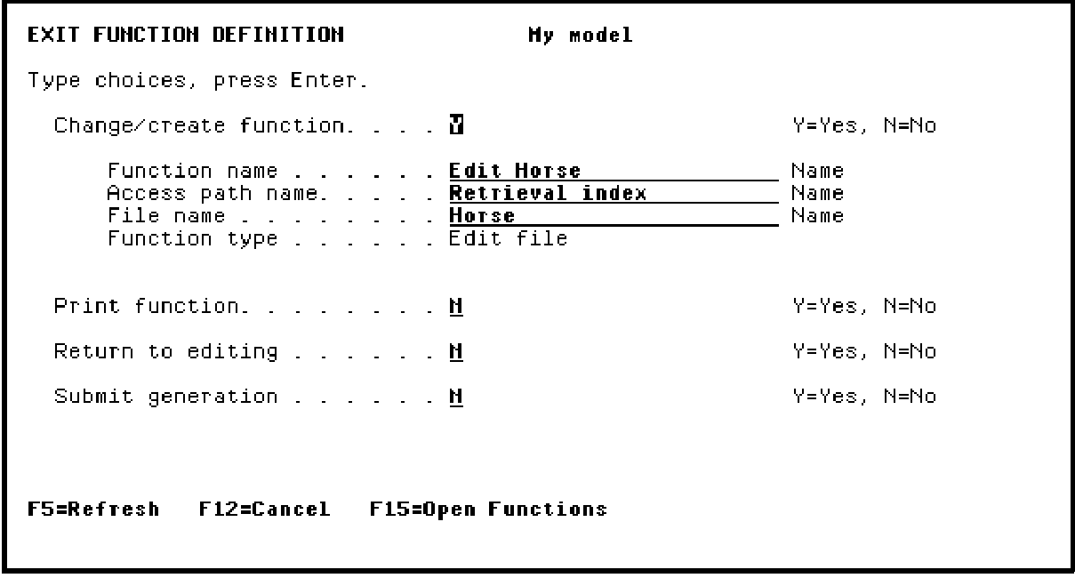 The Exit Function Definition panel lets you optionally save any changes to the device design. You can also change the name of the function, access path, or file. From this panel you can also print the function details, return to editing the device design, or submit the function for generation.