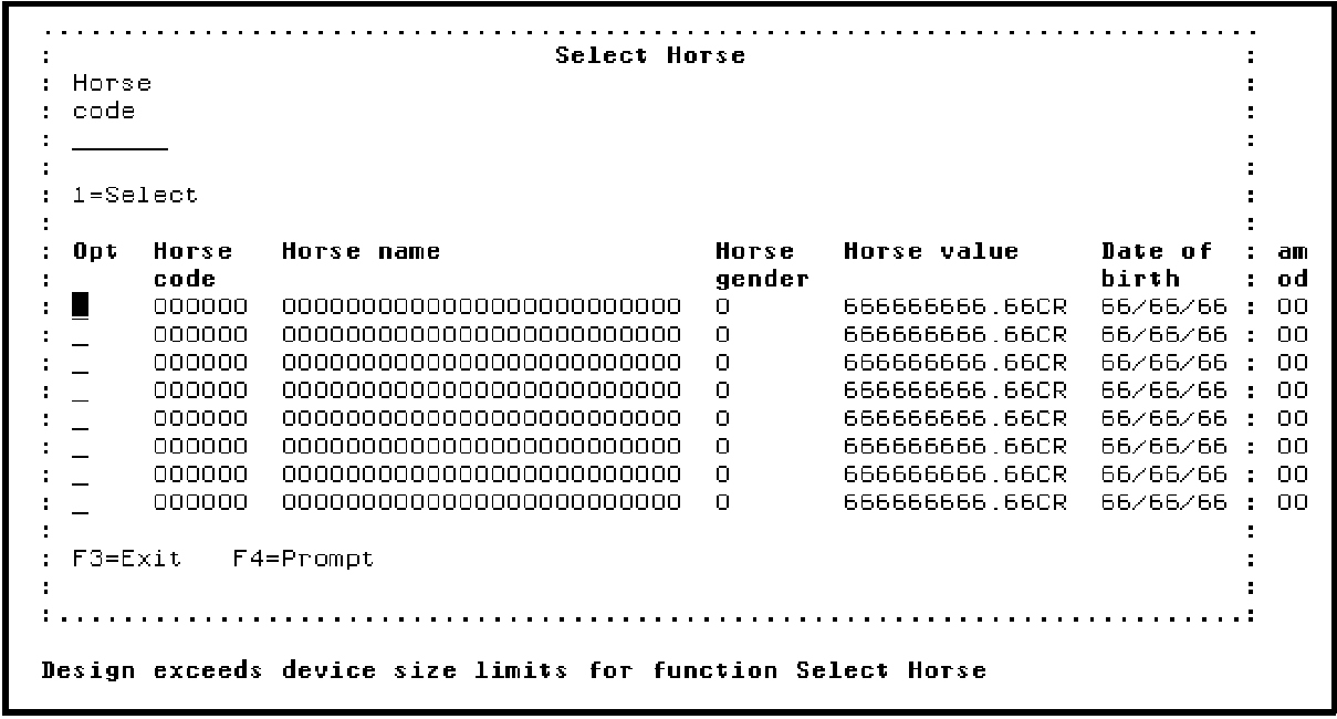 A default window device design displays. The subfile control format shows only the key fields and the subfile record format shows all fields on the HORSE file. You can use any of the procedures shown in the previous section to modify the device design. In addition, in this step, you will hide all of the fields in the HORSE file other than Horse code, Horse name, Horse gender, and Date of birth in the subfile record format.