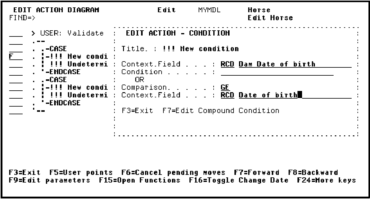 Note that when you add this condition to the action diagram for Edit Horse, the context for both fields in the comparison will be RCD since they are both from the subfile record.