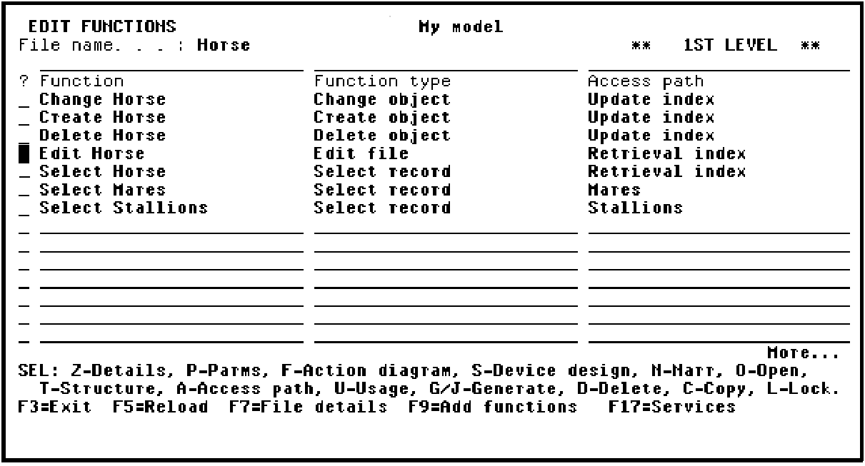 Note: The F13 function key (Fast exit) provides a quick way to exit the action diagram. You can use F3, but it will take you back through the action diagram one level at a time.
