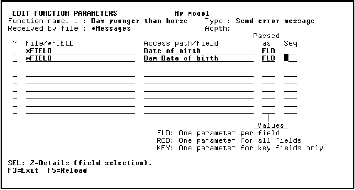 You are now ready to specify the message parameters. There are two ways of specifying function parameters. The simplest is to name the individual fields that are to be passed as parameters (*FIELD). In this case, you will define two fields as parameters: Date of birth and Dam Date of birth.