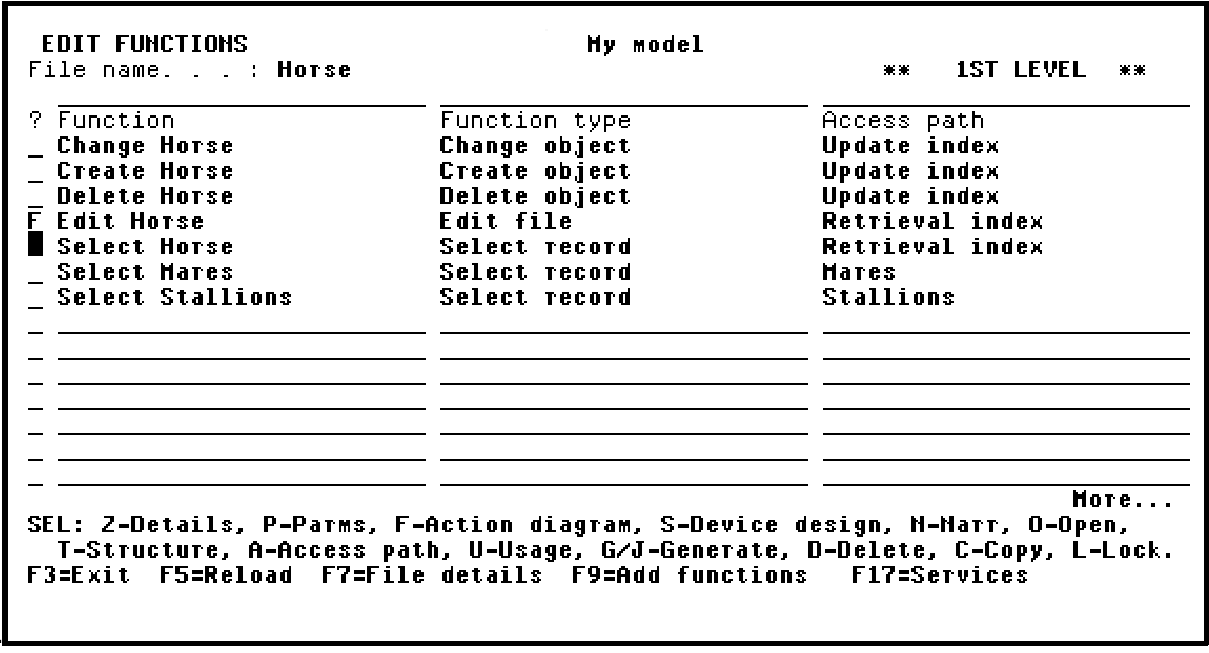 Type F against one of the relations and press Enter to display functions for the HORSE file. Type F against the Edit Horse function.