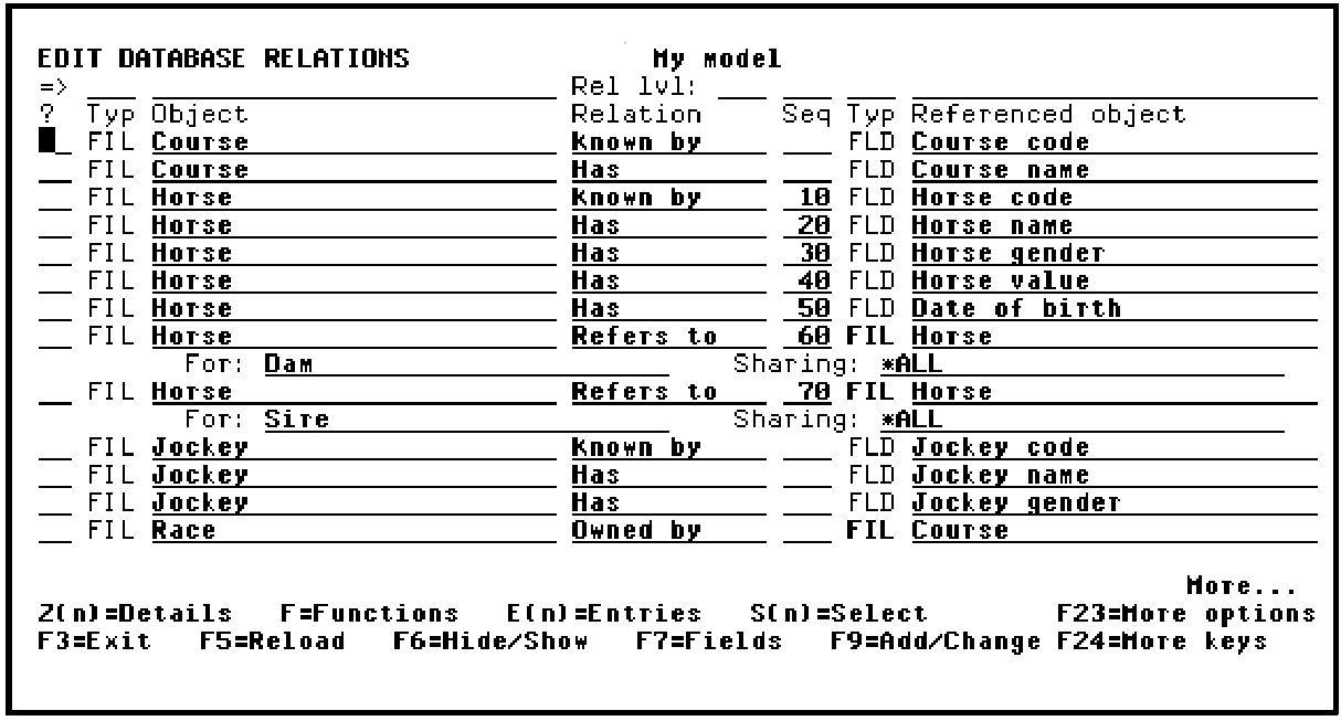 From the Edit Database Relations panel, press F17 to go to the Display Services Menu.
