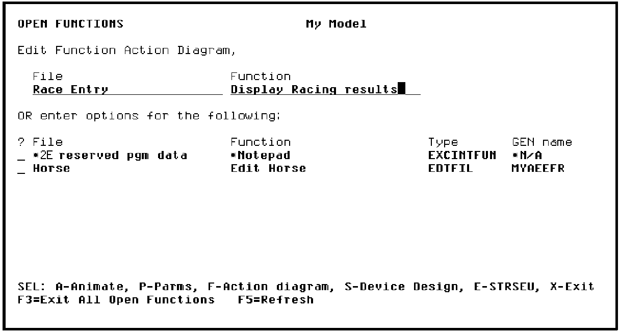 Note that the Edit Horse function is listed on the Open Functions panel since you have not yet exited and closed it. To open another function, type the name of the file and the name of the function in the File and Function fields. If you are uncertain of the names, type ? in these fields instead to display selection lists. You can also type * for the File field if the function you wish to open is attached to the same file as the first open function listed, in this example, the HORSE file.