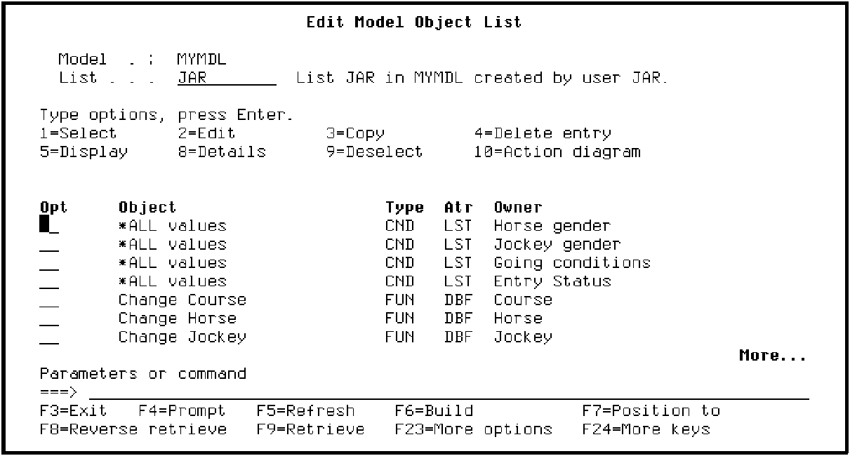 The Edit Model Object List panel serves as an alternate entry point into your model. It has a PDM-like interface that you can use to perform most functions available from the Edit Database Relations panel. The exceptions are that you cannot edit relations or create model objects.